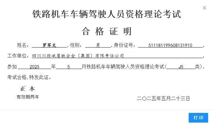 國家鐵路局鐵路機車車輛駕駛?cè)藛T資格考試作為國家級行業(yè)考試,由國家鐵路局統(tǒng)一組織。在公司的統(tǒng)籌安排和支持下,今年4至5月,該員工全脫產(chǎn)參與了中鐵成都局組織的鐵路機車車輛駕駛?cè)藛T全封閉式集中培訓(xùn)。培訓(xùn)時長超過40天,在高強度的學(xué)習(xí)任務(wù)與緊張的培訓(xùn)節(jié)奏下,該員工憑借毅力與努力,以扎實的理論基礎(chǔ)取得了優(yōu)異成績,理論考試兩門科目《安全規(guī)章》和《專業(yè)知識》分別拿下97分和95分的高分,綜合評定成績合格。